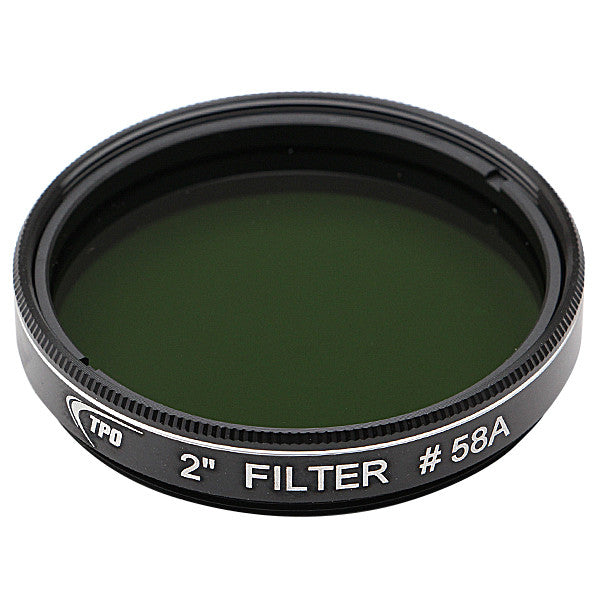 #58A Green (24% transmission): Use the #58 Green Filter on telescopes 8" aperture and larger to reject blue- and red-toned structures on the surface of Jupiter and thereby increase their contrast relative to lighter parts of the disc. The TPO 58 Green Filter can also be used to enhance Saturn cloud belts and polar regions. This filter strongly increases the contrast of Mars; polar ice caps, and increases contrast of atmospheric phenomena on Venus.