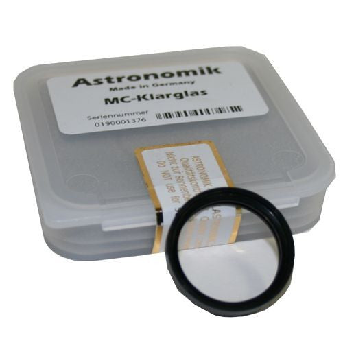 • This Multicoated (MC) glass serves as dust protector or to keep your system parfocal with other Astronomik filters. This filter should be used if the focal plane of your imaging system should stay in the same place as with other Astronomik filters in place. The multicoating prevents you from unwanted reflections. It blocks neither IR nor UV.