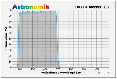 • Astronomik has a long history of top quality filters, and the L2 is just another testament to that reputation's truth. Working as a perfect UV-IR blocking filter, it lets the full range of sensitivity of the human eye (according to DIN 5031) pass, and blocks all other parts of the spectrum in the UV and IR. This makes it an ideal choice as a luminance filter for any kind of digital photography. It is optimized for systems with focal ratios between f/0.5 and f/50, and the typical transmission is higher than 99-percent. The UV-IR Blocker gives you a perfect parfocal filter for the luminance channel. It is also great as a dust protection for your telescope and camera. The high quality L2 has an very impressive spectral window- see the graph above for exact transmission rates.