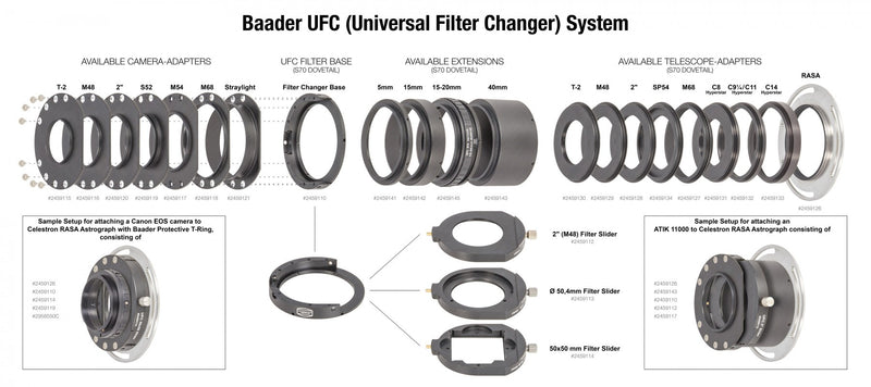 • This is one of the interchangeable filter sliders for Baader's UFC system, and in this case is designed to hold 50 - 50.5mm Unmounted filters. UFC is an acronym for Universal Filter Changer, and the UFC system is exactly that; a highly modular system of interchangeable parts that come together to create a system that can be used to freely exchange filters with minimal effort during imaging sessions.
