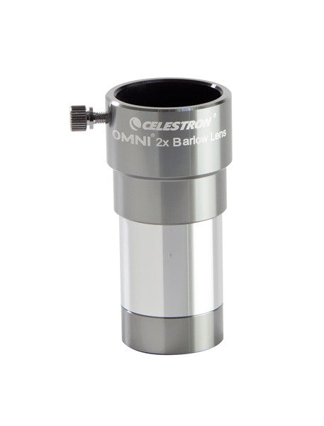 • The Celestron Omni 2X Barlow 1.25-inch has a titanium-colored finish, short focal length and double the magnifying power! The Celestron Omni Barlow will deliver excellent contrast for higher-power lunar, planetary, and double-star viewing, as well as getting that "close up" view of terrestrial subjects. With its relatively short focal length, the Celestron Omni 2X Barlow will work well in most star diagonals and blackened internal anti-reflection threading means improved image contrast.