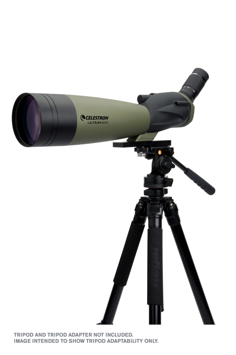 • When you pick up a Celestron Ultima 100 Angled 100 mm 45-Degree Waterproof Zoom Spotting Scope you're picking up a high quality, 100 mm aperture refractor telescope with a 540 mm focal length and f/5 focal ratio. Just like its "big brothers", the astronomical telescopes, this Celestron refractor uses high-quality optical glass for superior image quality and fully coats the optics for the best possible image performance.