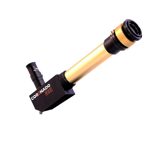 The double stacked Personal Solar Telescope (PST) from Coronado Solar is one of the most accessible options available for H-Alpha solar viewing and imaging. This model of PST has been designed from the ground up with the goal of creating a telescope fully optimized to be the ideal instrument for H-alpha bandwidth solar astronomy, and it shows on every level of performance. The double stack model, as suggested by its name, uses a double stacked 0.5 angstrom bandpass h-alpha solar filter as an integrated component of its optics. The PST shows prominence and solar surface details with a stunning level of clarity and sharpness, and features a built in solar viewfinder as well as a 40mm external tunable Etalon, a 20mm Kellner eyepiece, an integrated focuser, and bandpass fine adjustment controls.