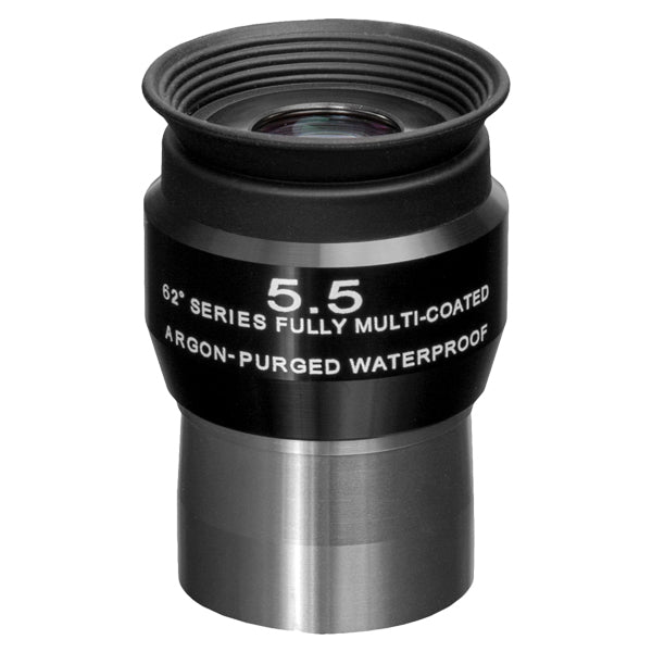 • Explore Scientific's 62 Degree 5.5 mm Eyepiece is a paragon of three important values; comfort, quality, and value. With a 62 degree field of view and high-quality optics working together this low-cost eyepiece can definitely improve your visual astronomy experience beyond what you'd expect of such a small and easy to purchase eyepiece. The focal design of these eyepieces makes it very easy to view objects by looking slightly to the side of them, enabling you to view the faintest of night sky objects through the technique of averted vision. In summary, it is a high contrast and respectably high field of view eyepiece at an amazing price.
