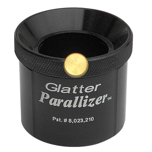 • The Howie Glatter 2.0-inch to 1.25-inch Parallizer Eyepiece Centering Adapter from Starlight Instruments: is designed to ensure dead parallel alignment between a 2-inch drawtube and a 1.25-inch accessory. It works by clamping the cylindrical surface 1.25-inch barrel between two parallel straight edges. Like dropping a cylinder into a V-block, it's totally wiggle-free. The straight edges can be seen in the photo looking down the 1.25-inch barrel.