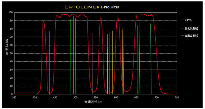 • The Optolong L-Pro filter (1.25-inch version) is designed to improve the visibility of various deepsky objects. By selectively reducing the transmission of wavelengths of light pollutants, specifically those produced by artificial lights including mercury vapor lamps, both high and low pressure sodium vapor lights and the unwanted natural light caused by neutral oxygen emission in our atmosphere (i.e. skyglow). Together with the highly transparent in main nebula emission lines at OIII (496nm and 500nm), H-beta (486nm), NII (654nm and 658nm), H-alpha (656nm), as well as SII (672nm), the filter is suitable for enhancing the contrast and details for both visual and photographic purpose at sub-rural area with heavy light pollution.