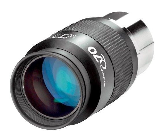 Each Q70 has five telescope lens, multi-coated, high-index glass elements for sharp, high-contrast images with excellent color correction. Eye relief is a luxurious 20mm. All telescope eyepieces in the Orion Q70 series are parfocal, so you can change eyepieces without refocusing. Machined housings have fold-down rubber eyeguards and a rubber grip band. Threaded chrome-plated barrels accept 2" filters. Two end caps are included.