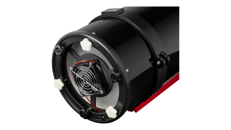 Weighing only 16 lbs. and just 28" long, this instrument is easily supported on a mid-sized equatorial mount, like the Atlas II EQ-G. The 200mm-aperture parabolic primary mirror is made from low-thermal-expansion BK7 optical glass. Enhanced aluminum mirror coatings with 92% to 95% reflectivity deliver more light to the focuser. A cooling accelerator fan is included on the primary mirror cell for rapid temperature equilibration, to ensure stable images.