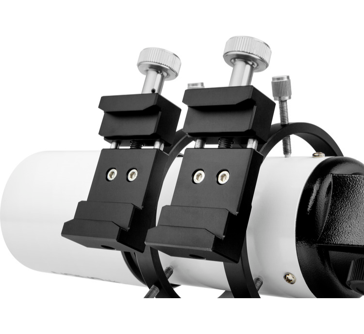 • Orion 120 mm Guide Scope Rings with Dual-Width Clamps - this guide scope mounting system features a pair of sturdy aluminum rings with a 120 mm inside diameter, each featuring three plastic-tipped metal thumbscrews to adjust the aim of the guide scope. Each ring is mounted on a machined aluminum dovetail clamp that sports two grooves to accommodate either Vixen or Losmandy style dovetail plates (sold separately).