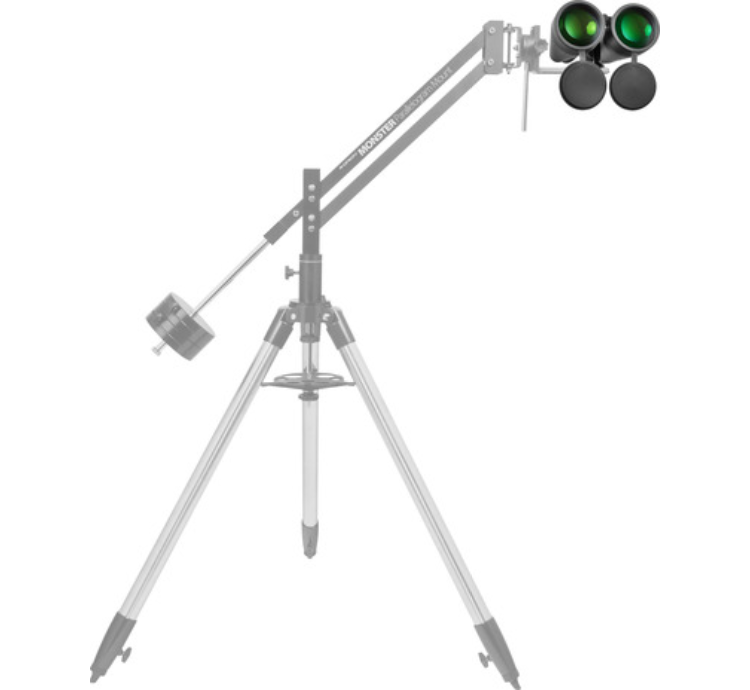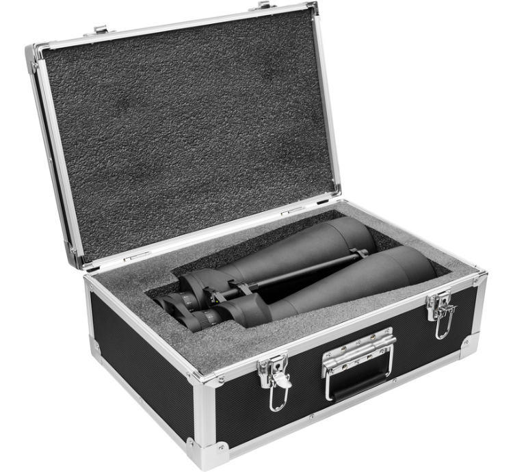 The tripod mounting bar clamps to the central support rod and attaches securely to a standard photographic tripod. Note that these binoculars weigh 9.2 lbs., so a solid and well-made photo tripod or parallelogram mount is highly recommended! Includes lens caps, tripod pier adapter, and a hard carrying case with foam cutouts to securely protect your giant binocular.