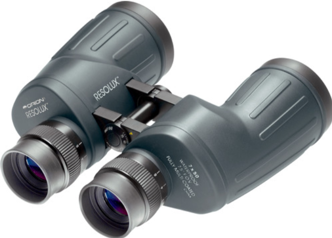 • Rugged 7x50 Orion Resolux astronomical binoculars have high-resolution, flat-field optics that yield sharp, detailed views of both night and daytime skies
