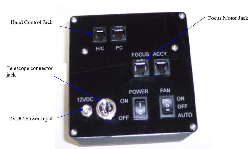 The PlaneWave Electronic Focus Accessory Kit plugs into the temperature sensors and fan control wires that come standard with each telescope. A Celestron Hand Control is provided with customized software to control the Focuser, the fans, and to read out the temperature of the ambient sensor and the mirror sensor. The EFA kit comes with PWI Focus, a software package that controls the focuser from a PC. All the cables are provided to attach the EFA kit to a PC. The PlaneWave Electronic Focus Accessory kit is ASCOM compatible.