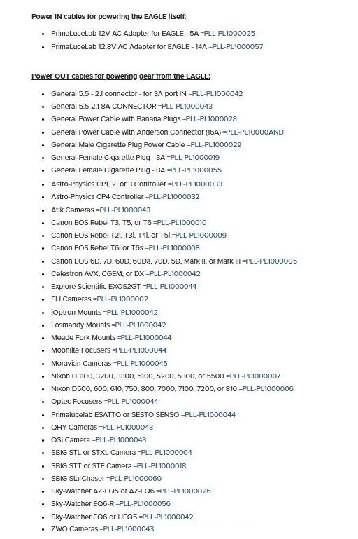 In order to make the EAGLE system more efficient, PrimaLuceLab has made special power cables for different devices like mounts or cameras (sold separately). The EAGLE-compatible power cables have an instrument power jack (for 12V power) on one end, and the EAGLE screw-in connector on the other in order to prevent power cables from being disconnected accidentally from the EAGLE.