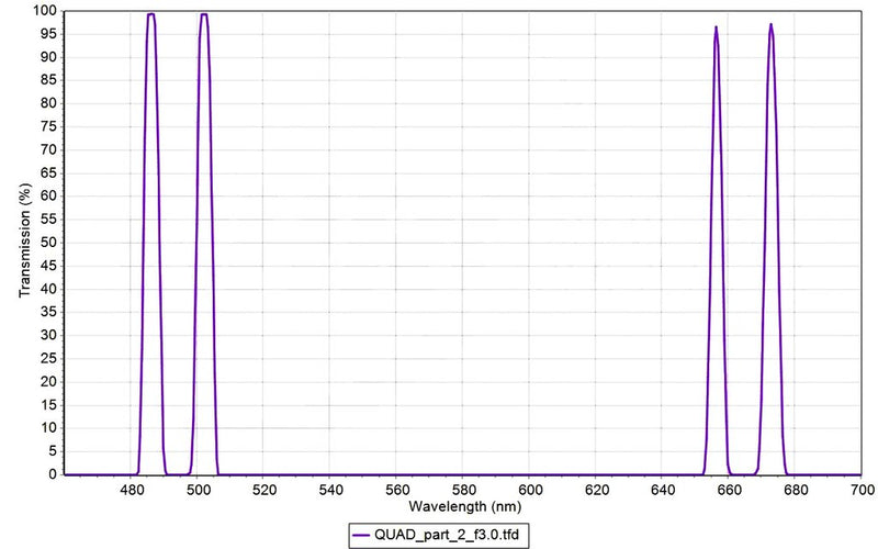 With the Pre-Shifted Triad Ultra, the f/3 beam has a 9.5-degree half cone angle. Filters with bands this narrow shift 1.5nm to the blue. This causes the transmission at the lines of interest to get reduced. The Pre-Shifted Triad Ultra is designed to be 1.5nm shifted to the red, so that in the f/3 beam they are adjusted perfectly. This specially-optimized Triad Ultra for fast  telescopes around f/3 will provide significantly better performance at ultra-fast focal ratios than the original Triad Ultra. Below you'll see a spectra that shows the Pre-Shifted Triad Filter's calculated for performance with an f/3 light cone: