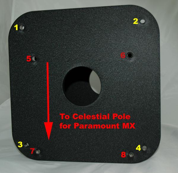 The bottom of the Paramount ME/MX Permanent Pier has four slotted holes that provide approximately 10 degrees of rotation (minimum 5 degrees) for polar azimuth adjustment. The pier can be attached to the ground via the base plate with four 12.7 mm (0.50-inch) J-bolts placed in the concrete (J-bolts are available from any hardware store). It is recommended that the base plate remain in contact with the cement surface to optimize damping. The top plate for the pier is constructed of 12.7 mm (0.50-inch) thick steel plate and is drilled to accept either the Paramount ME or the Paramount MX. See the picture above that has numbers in red and yellow. The Paramount ME mounting holes are labeled 1-4 in yellow text, and the Paramount MX mounting holes are labeled 5-8 in red text.