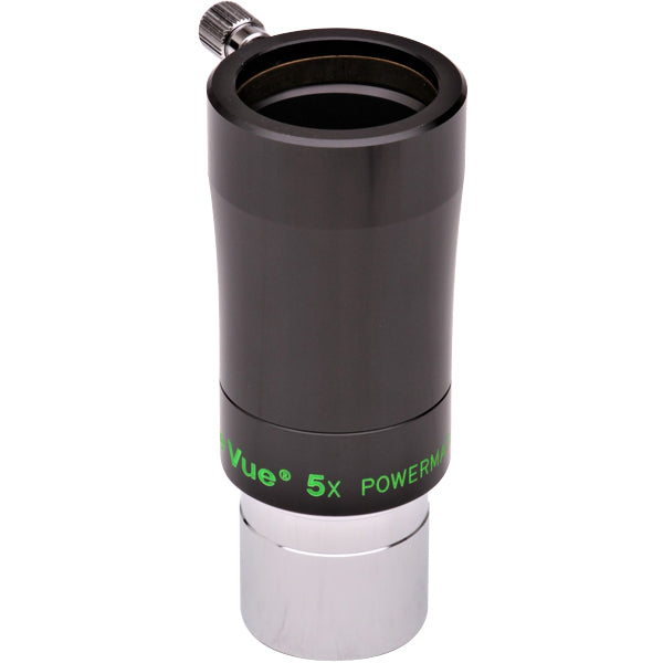 The Tele Vue 5X PowerMate Image Amplifier is fully multi-coated, with blackened lens edges and internal anti reflection threading for excellent contrast. Extra features of the 5X PowerMate include a chrome barrel threaded for standard 1.25-inch filters, and an undercut safety groove in the barrel that helps hold the PowerMate in place should the focuser thumbscrew accidentally loosen. Have you ever dropped a thumbscrew in the dark only to never find it again? No more! A non-marring brass clamp ring comes complete with a captive thumbscrew that holds your eyepieces securely in place. The Tele Vue 5X PowerMate is 3.8-inches in length and includes a short chrome barrel that allows it to be used in star diagonals. It is also parfocal with Tele Vue Plossls below 32 mm focal length and is optically corrected down to f/4 for use with fast f/ratio reflectors. You'll find the Tele Vue PowerMate will provide excellent performance with any telescope type or focal ratio. What's more, the it is parfocal with the 1.25-inch diagonal of the Tele Vue Ranger for quick power changes during terrestrial observing.