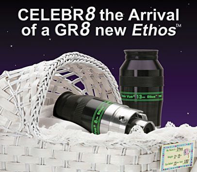 • The Tele Vue Ethos eyepieces have pushed the boundaries of optical excellence and maximum field of view, creating an unrivaled eyepiece experience. An important benefit of the combination of large apparent field of view and shorter focal length is that for a given field in the sky, higher magnification results in a darker sky background. Fainter stars become visible and more detail is seen on all deep sky objects. The Tele Vue Ethos eyepiece provides another big magnification/contrast jump, yielding dramatic views simply not previously possible in any telescope. With the smaller exit pupil, eyesight limitations are also reduced. The Televue 8 mm Ethos delivers: 100¨degree apparent field (50% larger in area than 82 DN (degreeNaglers), comfortable eye-relief, accepts DIOPTRX eyesight astigmatism correctors, distortion correction, high contrast and on-axis sharpness for planetary viewing. It is the 'do-it-all' eyepiece perfect for all scopes that can utilize this focal length.