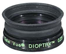 The visual experience in astronomy is maximized by stripping away limitations: the limitations of the observing location (dark skies and steady seeing)... the limitations of the telescope (aperture, field, resolution, and contrast)... the limitations of the eyepiece (field, resolution, and contrast)... and the limitations of our eyesight (e.g. astigmatism) TeleVue has historically been dedicated to overcoming the first three of these limitations with wide angle, flat field telescopes easily portable for traveling to great observing locations, matching ultra-wide angle eyepieces with full field image quality to generate what we call ƒ???????????spacewalkƒ??????????? viewing, and a variety of long eye relief eyepieces to allow eyeglass wearers to enjoy the maximum visual experience. To overcome the fourth limitation (astigmatism), Tele Vue has developed a corrector which fits directly onto the eyepiece. Just as Dobsonian owners could not fully appreciate the performance of Televue eyepieces until installing the Paracorr to compensate for mirror coma, the majority of the population (which has some eyesight limitations due to astigmatism) had no way to correct for this except by wearing eyeglasses. That is until now. Introducingƒ???????????DIOPTRX Astigmatism Correcting Lens Accessory, which extracts the maximum visual performance from matching eyesight to eyepiece. Televue DIOPTRX lenses attach to the top of over 20 long eye-relief Tele Vue eyepieces to compensate for eyesight astigmatism and are available in ????? diopter steps, from ????? diopter up to 2???? diopters. A series of engraved letters on the barrel helps to monitor orientation. All lenses are multi-coated glass in anodized aluminum housings with rubber eye guards. Observers do not need eyeglasses to compensate for near- or far-sightedness, since telescopes can focus out these limitations. Further, other eyeglass characteristics, such as bi-focal, tri-focal, or vari-focal (progressive) designs are severely detrimental when trying to view a large field at infinity. In the past, it was generally recommended getting a special pair of ƒ???????????astronomy-onlyƒ??????????? eyeglasses that only has your astigmatism correction and multi-coatings. However, frame styles may still limit field sizes and be uncomfortable in certain telescope orientations. We suggest reading "Determining When to Use Eyeglasses" found in the Supporting Docs tab to determine at what size exit pupil your astigmatism needs correction, since at higher powers )with their smaller exit pupils) eyeglasses may not be necessary. Note, however, that large exit pupils are typical for viewing with larger aperture instruments, such as Dobsonians, and for wide angle viewing with small refractors. Through experimentation, we have found that 2 diopters of eyesight astigmatism is detectable down to a 1mm exit pupil, and 1 diopter is detectable at a 2mm exit pupil. DIOPTRX lenses, therefore, obviate the need for a dedicated "astronomical eyeglasses" but there are other benefits aside from eliminating frame of comfort problems. The primary benefit is the potential of optimized correction in the amount and orientation of astigmatism for eyesight in astronomical viewing. The ability to compensate for both orientation and astigmatism, as our eyesight changes, is another advantage. Read "Understanding Your Eyeglass Prescription for Astigmatism" by Barry Santini for more detailed information. With multi-coated high quality lenses accurately aligned to the eyepiece, the serious enthusiast now has another tool to maximize the potential in seeing the faintest starts over wide fields, subtlest small planetary details, and the satisfaction of knowing they have the very best visual experience possible with their prized telescopes and eyepieces. The DIOPTRX can be used on these long eye-relief Televue eyepieces: