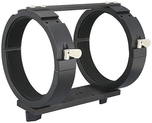 Televue Mount Ring Set for 5" diameter optical tube assemblies. Highlights include dual rings with bat-handle locks, accessory slots for Starbeam, Piggy-Cam, etc., and multi-hole base plate for attachment to various mounts and mounting adapters.