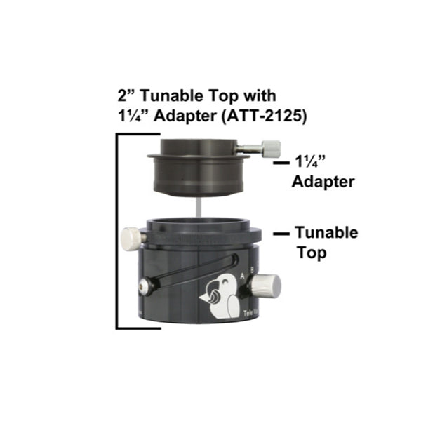 To use the TE-ATT-2125 2-inch Tunable Top by Televue, just remove the stop flange from the Big Paracorr, attach the VISA adapter (TE-AVI-3200) adapter to the top of the Big Paracorr Type 2 and then screw the Tunable Top on top of this adapter. However, the Televue TE-ATT-2125 2-inch Tunable Top will attach directly to a 2-inch Paracorr. Then adjust the sliding lever on the side of the Tunable Top barrel to position your eyepiece according to the chart which is provided by Televue, to obtain the optimum coma correction. The included 1.25-inch Adapter can be inserted into the top of the TE-ATT-2125 if needed for your task.