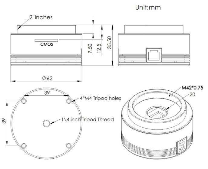 • Adapter: 2 inches to 1.25 inches (M42x0.75).